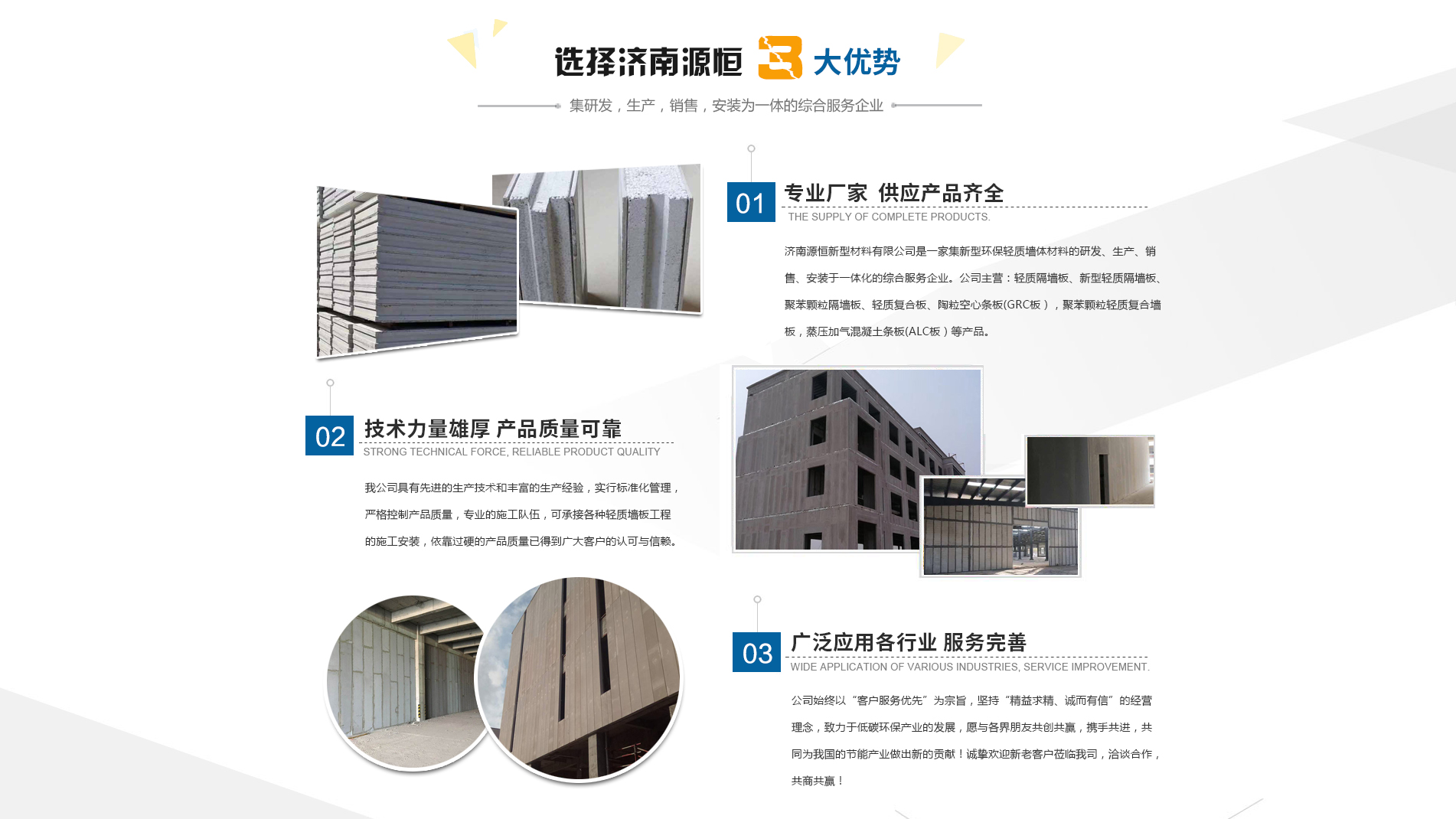 濟(jì)南源恒新型材料有限公司坐落于美麗的泉城濟(jì)南,是集新型環(huán)保輕質(zhì)墻體材料的研發(fā)、生產(chǎn)、銷售、安裝于一體化的綜合服務(wù)企業(yè)。我公司具有的生產(chǎn)技術(shù)和豐富的生產(chǎn)經(jīng)驗,為您提供輕質(zhì)隔墻板、新型輕質(zhì)隔墻板、聚苯顆粒隔墻板、輕質(zhì)復(fù)合板、陶??招臈l板(GRC板),聚苯顆粒輕質(zhì)復(fù)合墻板,蒸壓加氣混凝土條板(ALC板)等產(chǎn)品,本公司有專的施工隊伍,可承接各種輕質(zhì)墻板工程的施工安裝。輕質(zhì)隔墻板是國家推廣使用的新型輕質(zhì)、綠色無害建材,是墻改節(jié)能政策大力扶持的環(huán)保節(jié)能產(chǎn)品,是發(fā)達(dá)國家普遍采用的新型墻體材料。濟(jì)南源恒新型材料有限公司實行標(biāo)準(zhǔn)化管理,嚴(yán)格控制產(chǎn)品質(zhì)量,依靠過硬的產(chǎn)品質(zhì)量已得到廣大客戶的認(rèn)可與信賴。公司產(chǎn)品遍布各大城市,與國內(nèi)多家客戶建立了良好的合作關(guān)系。公司始終以“客戶服務(wù)優(yōu)先”為宗旨,堅持“精益求精、誠而有信”的經(jīng)營理念,致力于低碳環(huán)保產(chǎn)業(yè)的發(fā)展,愿與各界朋友共創(chuàng)共贏,攜手共進(jìn),共同為我國的節(jié)能產(chǎn)業(yè)做出新的...